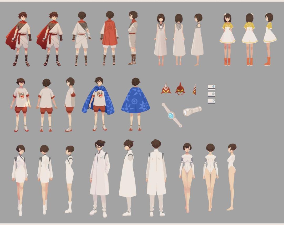 T恤是夏天的标配,红色是英雄的代表色,而简约是少年感的体现。哥哥的印象色是热烈而积极的赤色,因此以红为概念来展开角色刻画。也因为是夏季,所以运动短裤才是小男孩的王道!磕磕绊绊留下的伤痕、中二时代的英雄面具和色调对比强烈的蓝色披风,都是哥哥这个角色的标志。手表则结合了故事背景——AI时代进行设计,体现出简洁大方的未来感。