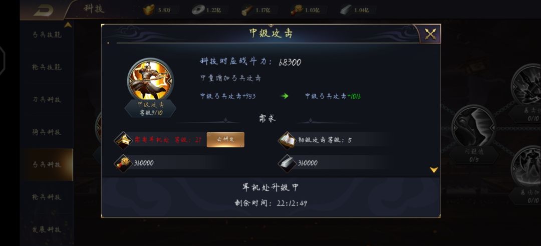 部队科技的话,最好是把等级要求范围内的科技全部升一级,因为第一级加的战力是最多的后面每升一级,加的都比较少