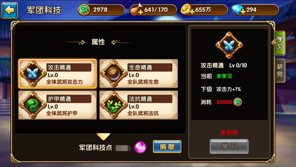 3、学习:军团成员需学习科技,科技加成属性才会生效,学习需消耗军团贡献度