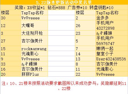 五月版本更新活动结束了,感谢大家的积极参与。我们会持续优化游戏和丰富游戏内容,给大家带来更好的游戏体验。接下来看下活动抽奖结果吧!(本次活动中奖没有获奖次数限制所以可以再名单内看到有几位玩家重复中奖!)