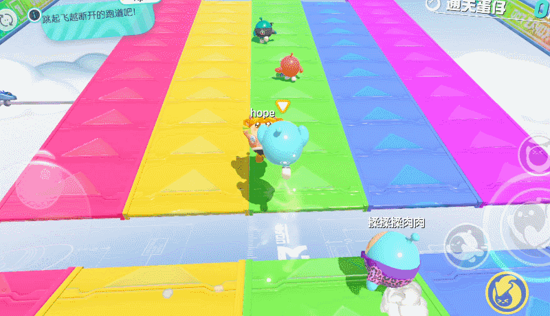 除了最基本的跑跳飞扑以外,我们还可以使用一个类似技能的“滚蛋”模式。激活后蛋仔就会变成圆球向前滚动,速度快,可跳跃,但是碰撞后会发生较大的反弹,所以建议大家在障碍物不多的时候使用。比如竞速赛中的直道,或是用于快速通过机关地板。