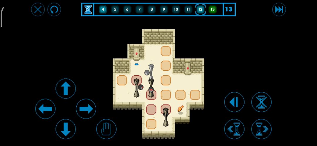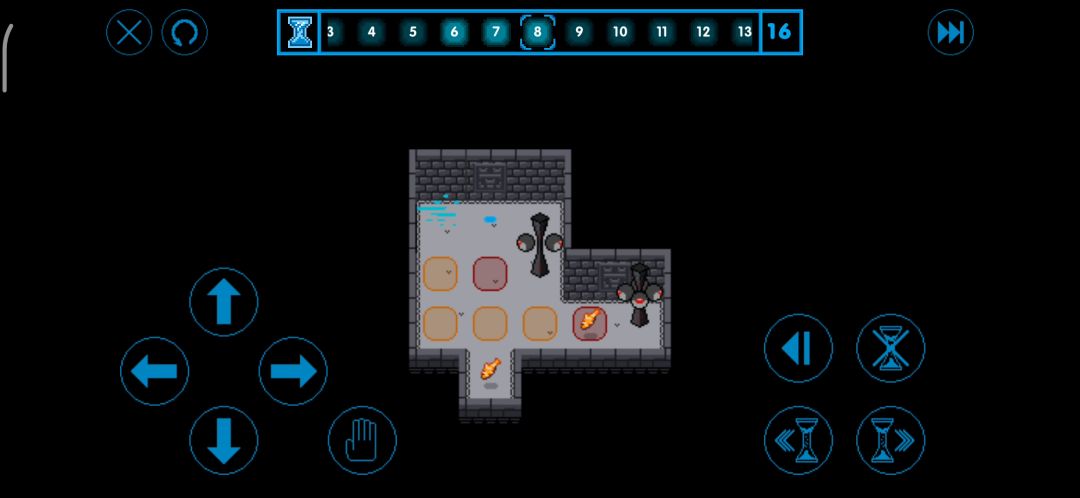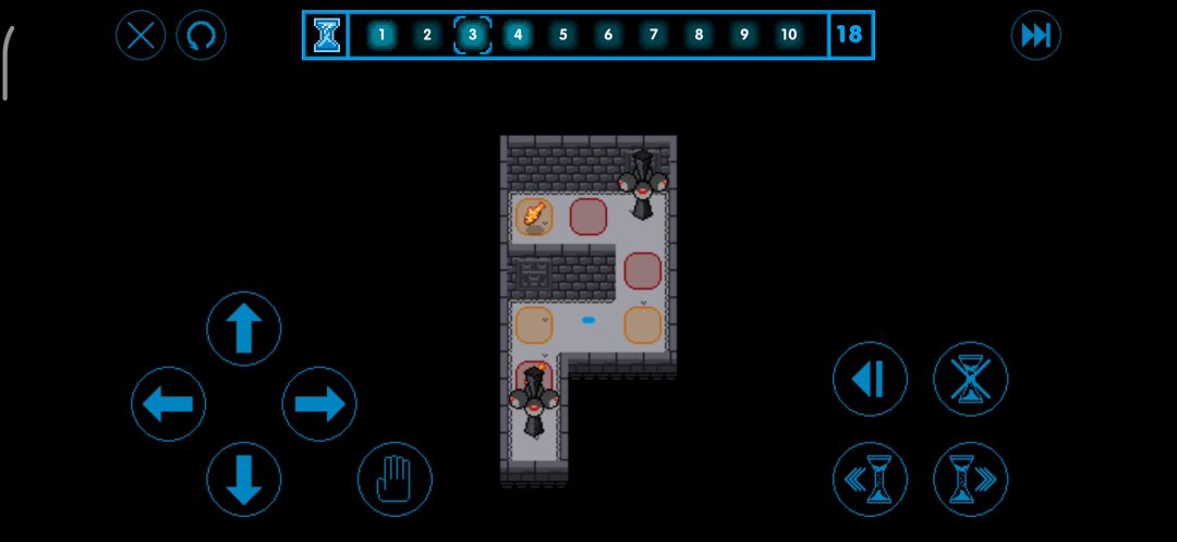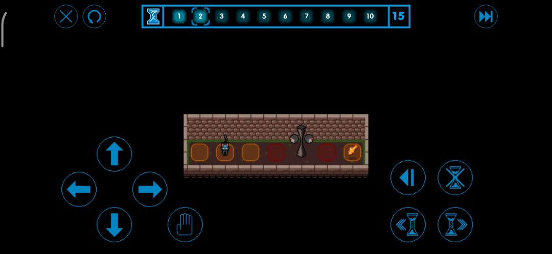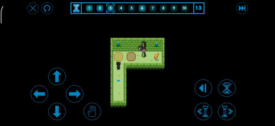 猫行动方式:通过右下两个按钮进入选择回合阶段,并在时间线上选择合适回合后,控制左下四个按钮控制猫的移动。另外的,猫进入选择回合阶段后无视守卫碰撞和抓捕。
