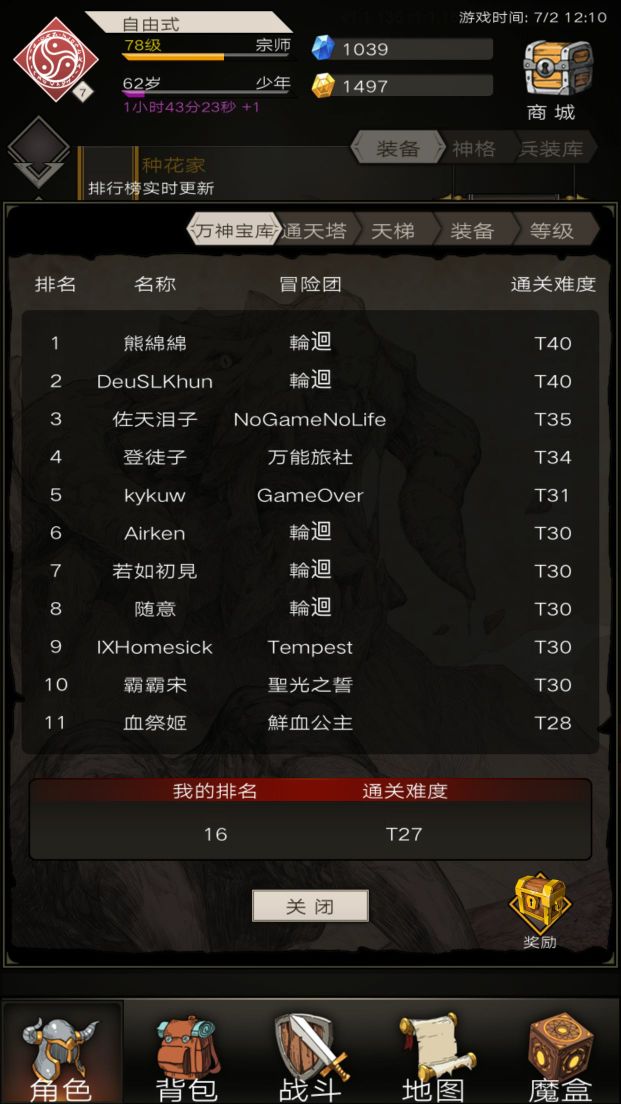 目前本人78级,万神T27,塔92层。装备评分不到12万