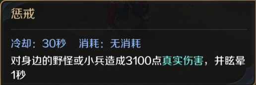 惩戒:只能对野怪和兵线使用,造成真实伤害,伤害数值1000-3100(随等级增长)