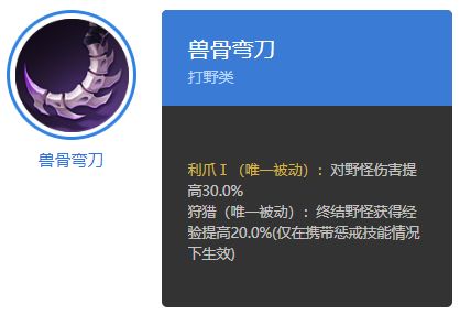 狩猎(唯一被动):终结野怪获得经验提高30.0%且获得金币提高20.0%(仅在携带惩戒技能情况下生效)。