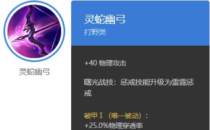 总结:物理三级打野刀“灵蛇幽弓”,建议在五神装之后再出。后期的25%物理穿透率属性尚可。