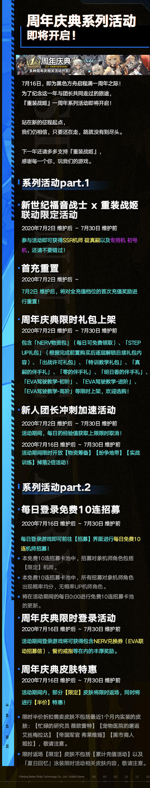 「重装战姬」×「新世纪福音战士」周年特别联动活动也将同时开启!参与联动活动将获得联动限定机师「碇真嗣」及专用机「初号机」,各位团长请不要错过!