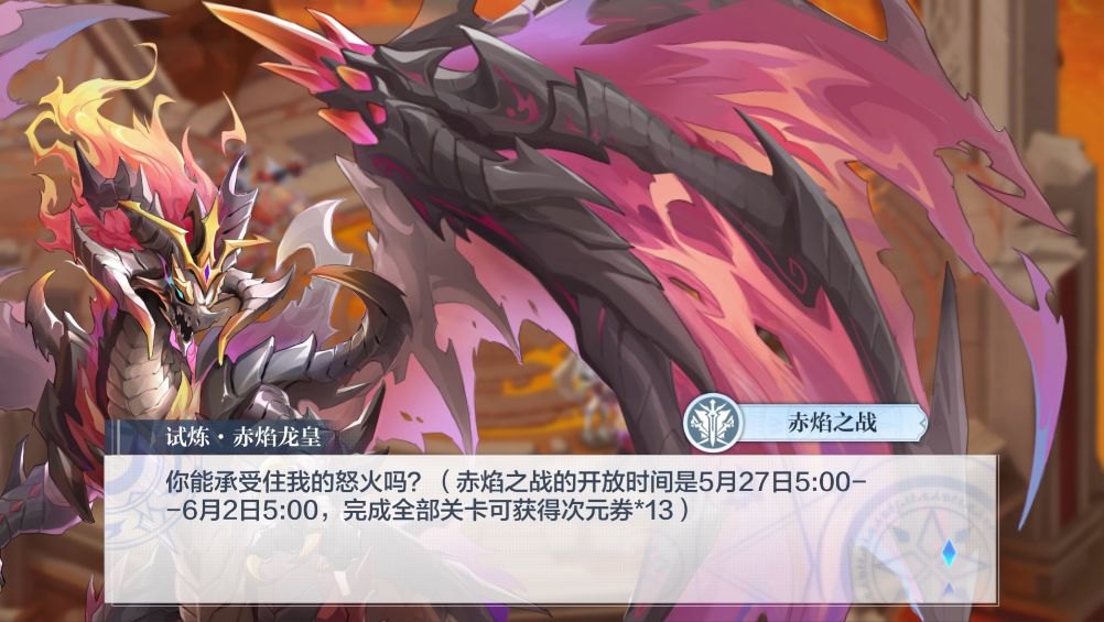 活动内容:赤龙银甲•火次元最新次元试炼关卡【赤焰之战】开放。