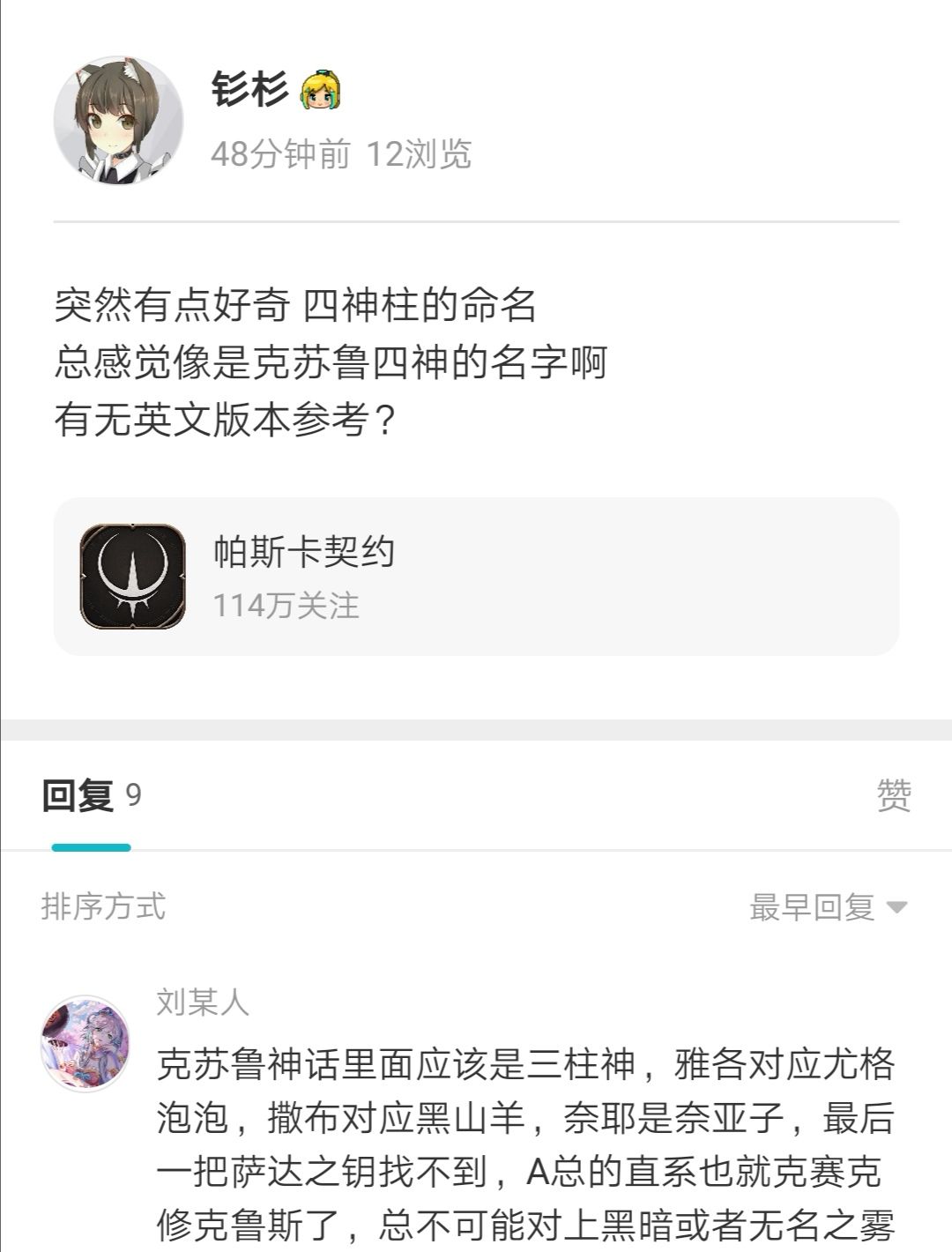 由于对克苏鲁神话有基本的了解,我本能地感觉这几个命名和某些外神的名字很像,于是在论坛发帖询问。
