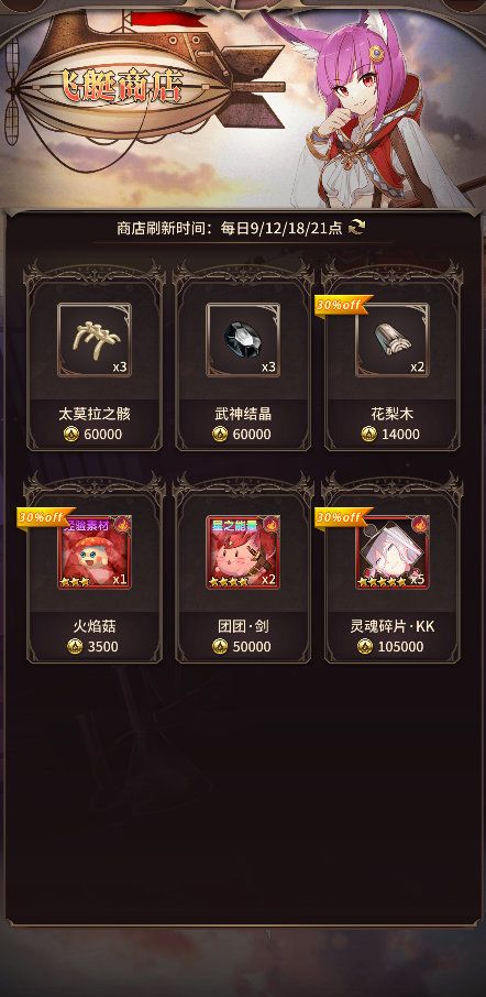 艾思对飞艇商店的受欢迎程度不够满意,决定启用新的经营策略。飞艇商店在下次更新后将会提高高级材料的出现几率,并加入材料兑换券和新的角色灵魂碎片等商品,同时部分商品将获得随机折扣。