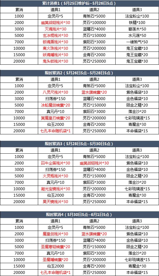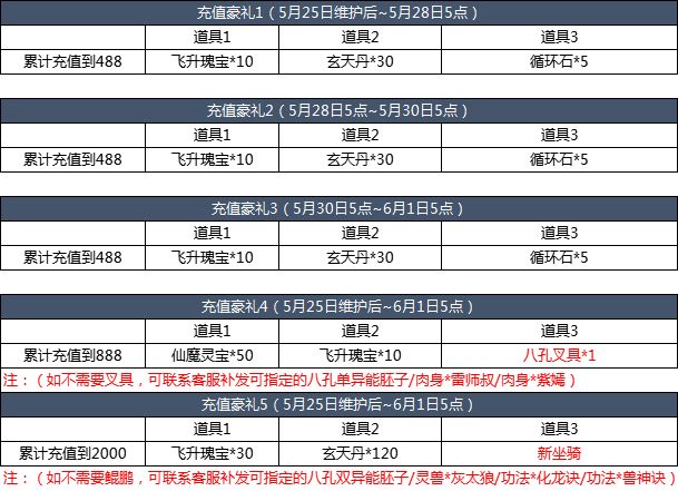 【活动时间】5月25日维护后~6月1日5点【活动简介】活动期间,每日累计充值达到指定金额即可领取相应好礼。