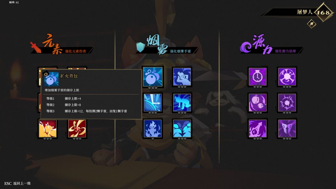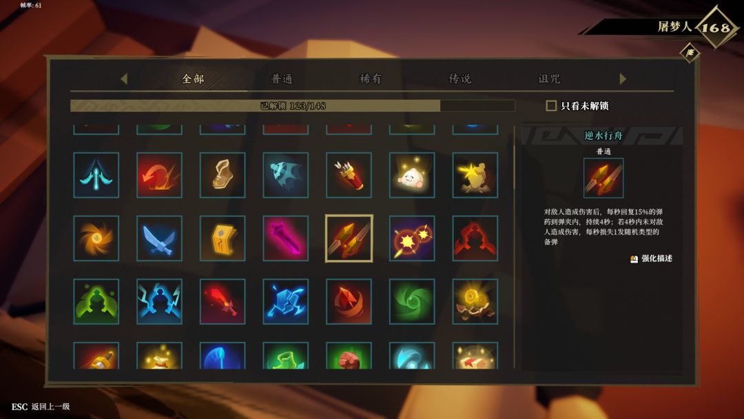 不过嘛,这些武器可不是一开始就能有的,本作严格来说是一款Roguelite游戏,死亡惩罚并没有那么严重,我们在刷关的同时可以获得资源在局外进行成长,从多个方面强化自己的角色以在游戏中走得更远,而当我们走得更远遇到更多强力的敌人后,就能通过击杀这些敌人或是达成其他条件来解锁武器、天赋等等,让它们会在接下来出现在关卡当中。