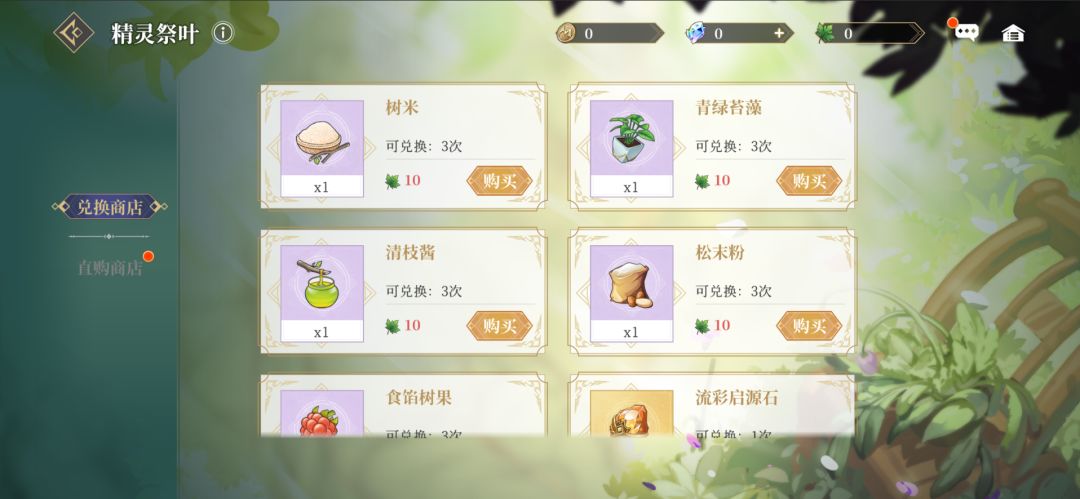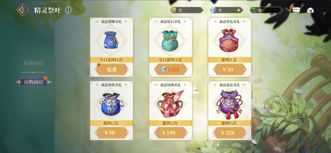 礼包详情如下:森意馈赠圣礼:内含绿野盛叶*5,免费获取,每日限购1次;