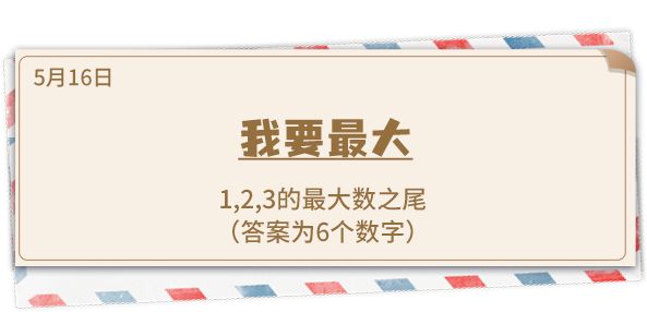 我要最大!看看题目:1,2,3的最大数之尾,答案是6个数字。想要破解这道题目,需要理解题目告知的意思是什么,123的最大数,不就是321吗?错!答案是3的21次方,所以可以得到:10460353203,“最大数之尾”的六个数字,答案是:353203!
