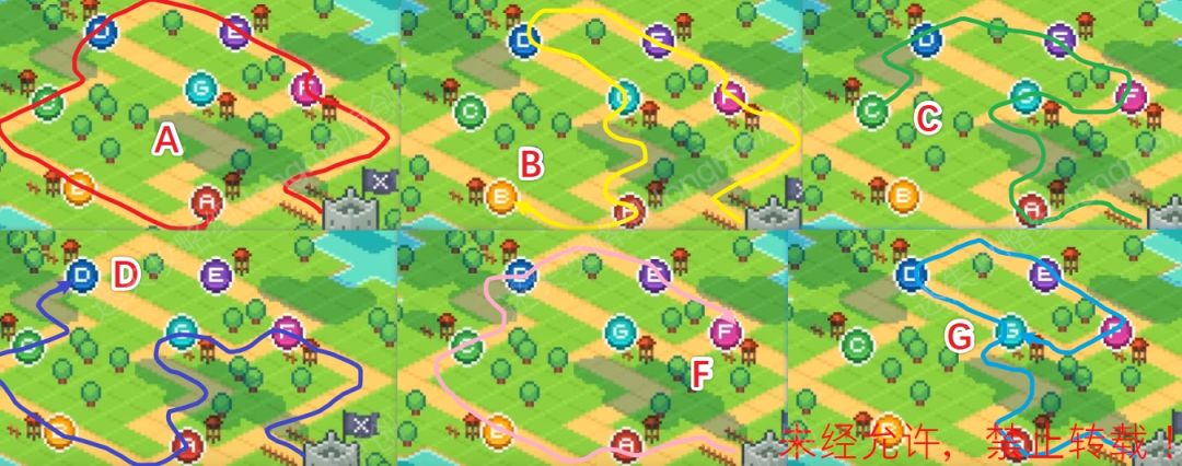 从城堡出发,不能有重复路线,连接六个字母,第六个字母不会是哪个,可以使用排除法,以每个字母为终点选择路线,得到答案【E】。131.1