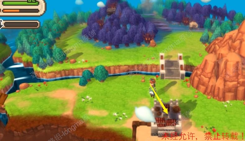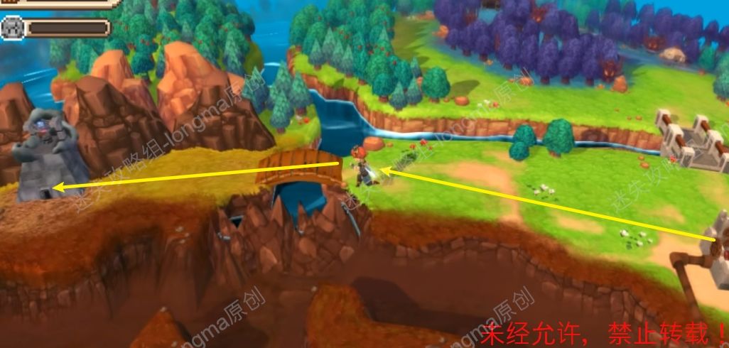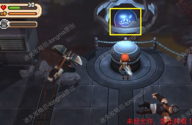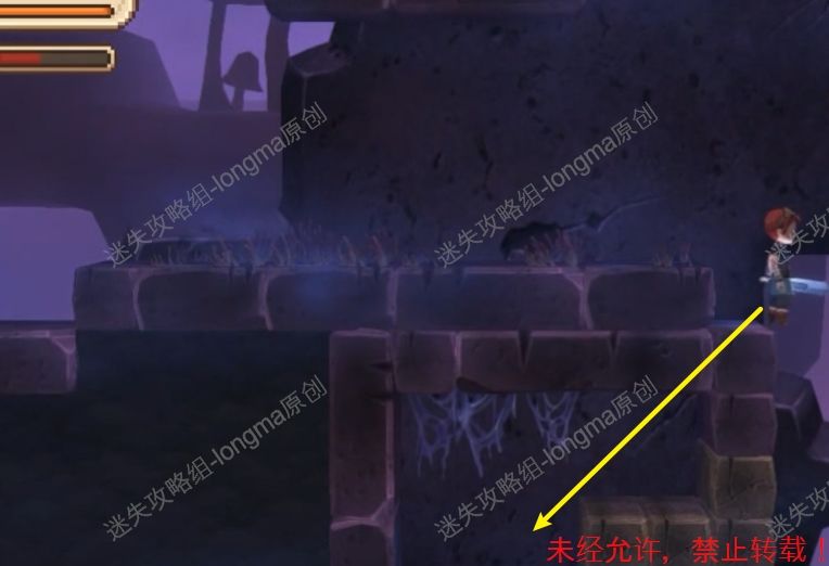 140.在如图140的位置(一排石块向下落下的关卡),向右击碎石块,找到宝箱,获得【奥利肯矿石】。140
