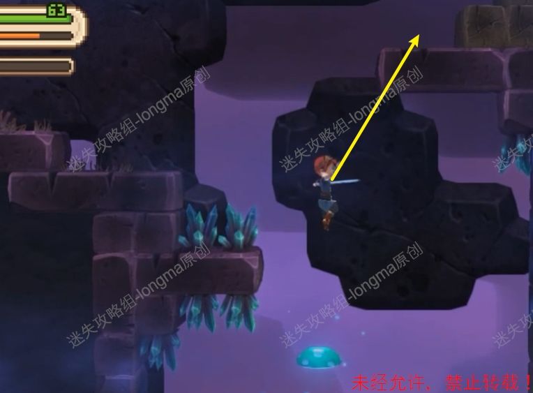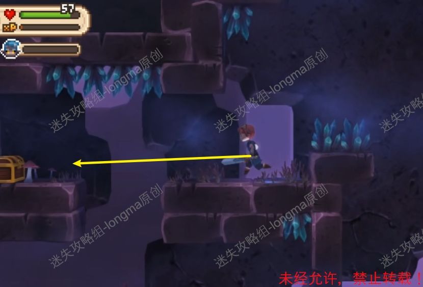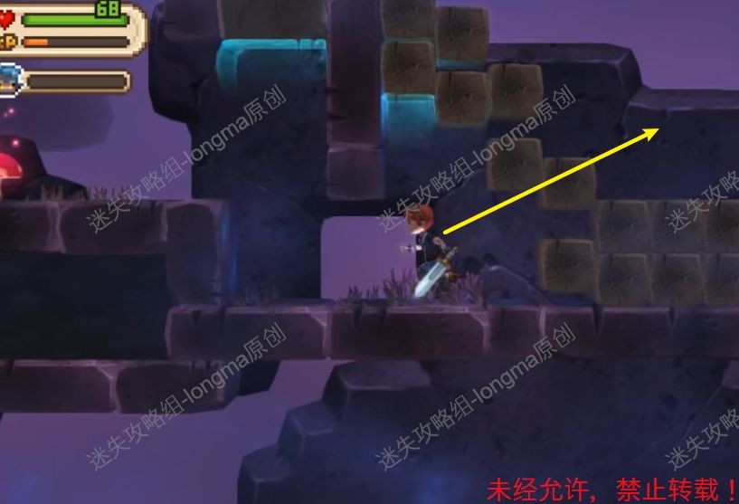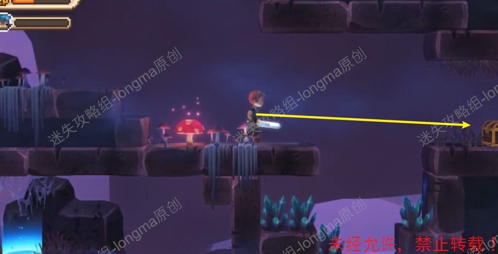 138.在如图138的位置(有许多蓝色蘑菇不断向上跳跃的地方)到达对顶端时,首先击碎右侧的石块,找到宝箱获得【玛钠】。138