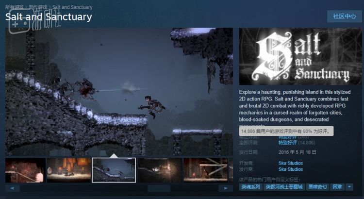 Steam老玩家可能还记得曾被称为“2D黑魂”的《盐与避难所》——在2016年,打上“魂味游戏”标签的作品还没那么多。而这个银河城玩法的游戏,从关卡设计再到战斗系统,对于《黑暗之魂》的模仿与致敬可谓毫不避嫌。