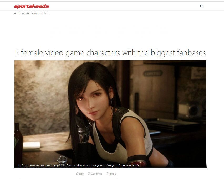 Sportskeeda发布了一篇“拥有最大粉丝群的5位女性游戏角色”的文章,其中「蒂法·洛克哈特」是最受欢迎的女性角色(拥有最多粉丝),之后排名分别是「劳拉·克劳馥」、「塞尔达」、「吉尔·瓦伦蒂安」、「萨姆斯·阿兰」