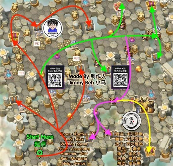 按照红线、绿线、粉线、黄线,依次进攻敌人即可。
