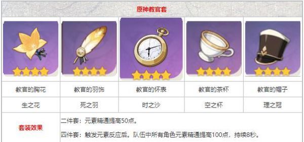 2、对于前期过渡的搭配:推荐选择教官4件,既提升自身元素精通,也为队伍提升元素精通。