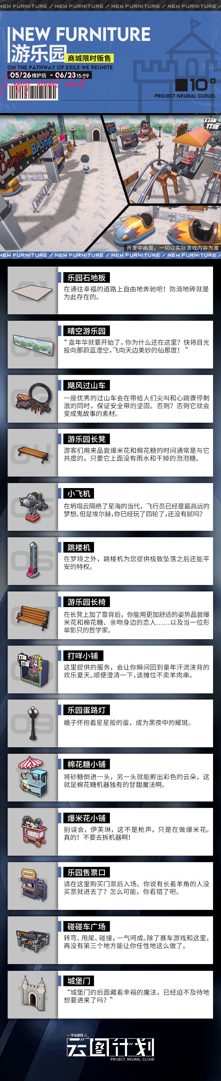 5月26日更新后,将实装全新家具套装【摄影棚】及【游乐园】,其中【摄影棚】主题家具可通过「逆波共振」活动获得;【游乐园】主题家具可通过限时家具采购获得。详情请看下图!
