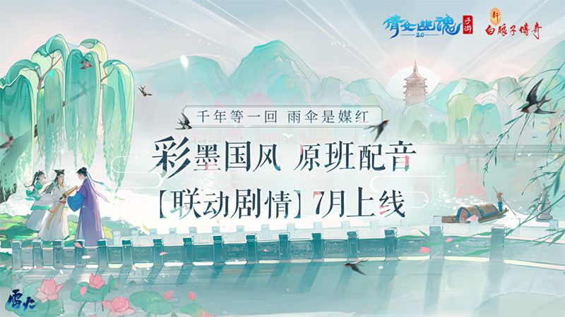 彩墨国风,原班配音,【联动剧情】7月上线。为了尽可能还原影视剧带给大家的感觉,倩女手游开发组不仅购买了多首经典歌曲的使用版权,还邀请了原班配音人马进行配音,为玩家带来原汁原味的体验。同时,本次联动不仅有全新联动时装、联动跟宠,倩女手游还特邀非遗老师【宋志明】制作了一款青白蛇主题的西湖绸伞,敬请期待~