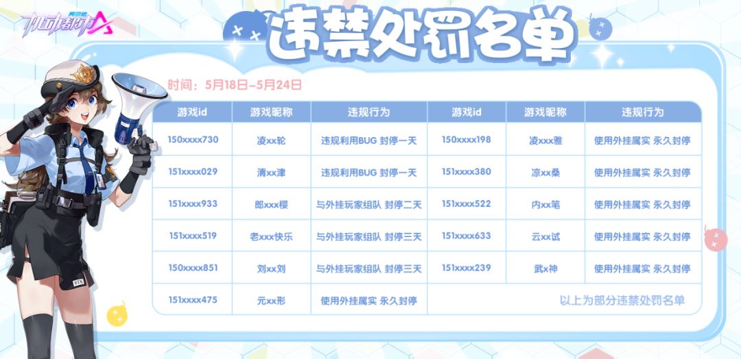 现将截止5月18日-5月24日的部分违禁处罚名单进行公示: