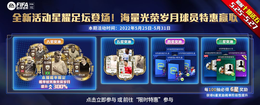 《FIFA足球世界》全新活动星耀足坛现已上线!活动中不仅有海量限定传奇球员还有当期限定的概率UP球员,概率是其他光荣岁月的300%,当期限时概率UP,机不可失快快参与起来吧!