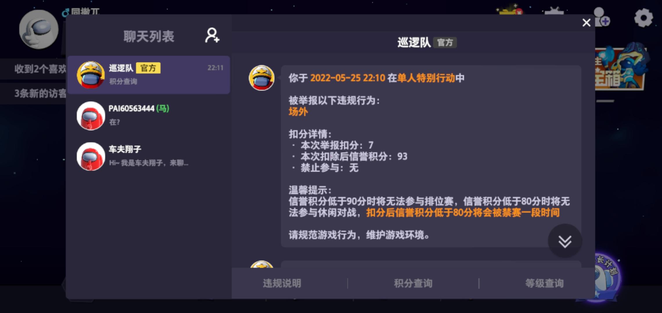 你们官方什么检测系统你告诉我,敏感词奇奇怪怪,还有那个查场外作弊,这个确实难,但是你能不能核实自己的数据而不是人家局内举报,你不管别的,结束立马扣分,虽然分不重要,但是我心很寒,给你介绍当时情况,就我刚刚一把对局,我是预言家我和另一个预言家棕色互保都互相查了,有双面人,在过程中我查到了黄色内鬼,后来关灯棕色被黄色刀了,我并不知道黄色是预言家,我以为黄色警长,我开了会议说棕色是预言告诉我了黄色内鬼,我指的局内说,当时双面死了,我怕没死,我并没有报出自己身份,然后b听到一口咬定我俩场外,举报了,最后还成功了,我想知道你们不核实一下数据,直接成功什么意思,我心特别寒,人家不了解情况,你们官方跟着胡闹?图放这,我希望官方能解释一下而且进行修改