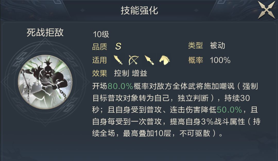 该阵容主要针对克制连击类阵容,面对主动阵容也有一战之力。通过死战拒敌的开局嘲讽,能让己方成为“陷阵之军”,虽然不携带增伤和减伤技能,但利用三名武将的自带技能效果就可以获取所需的增益,为技能搭配提供更多空间。