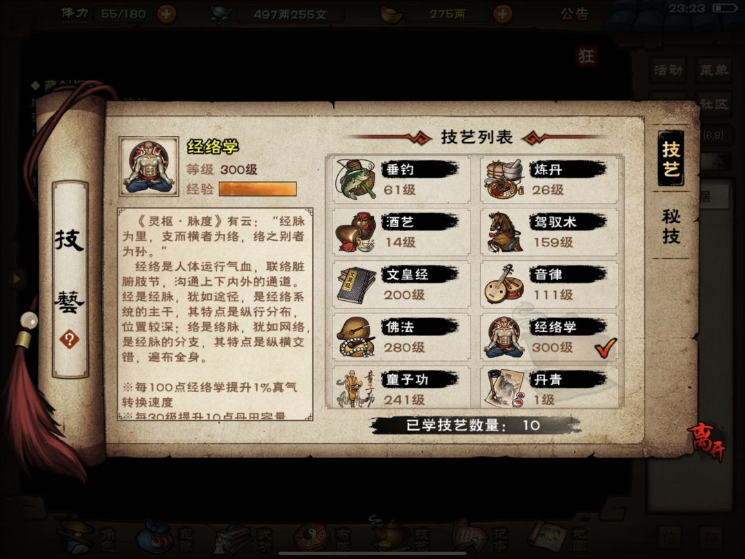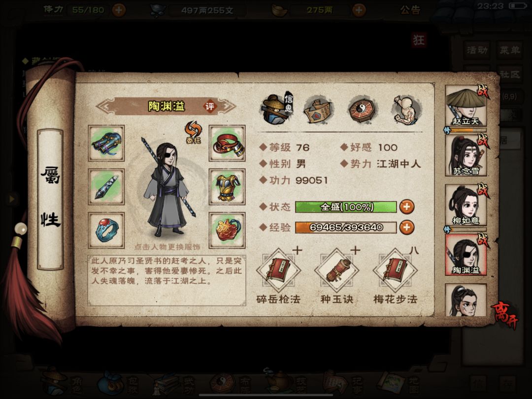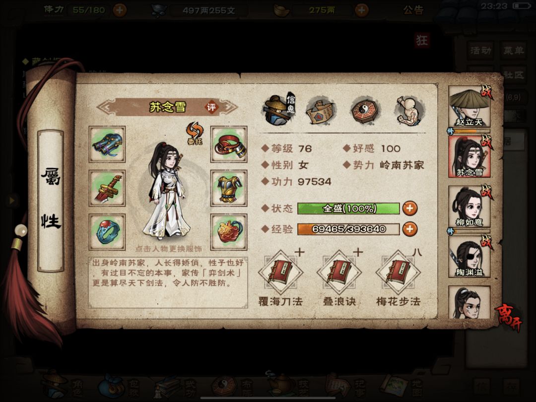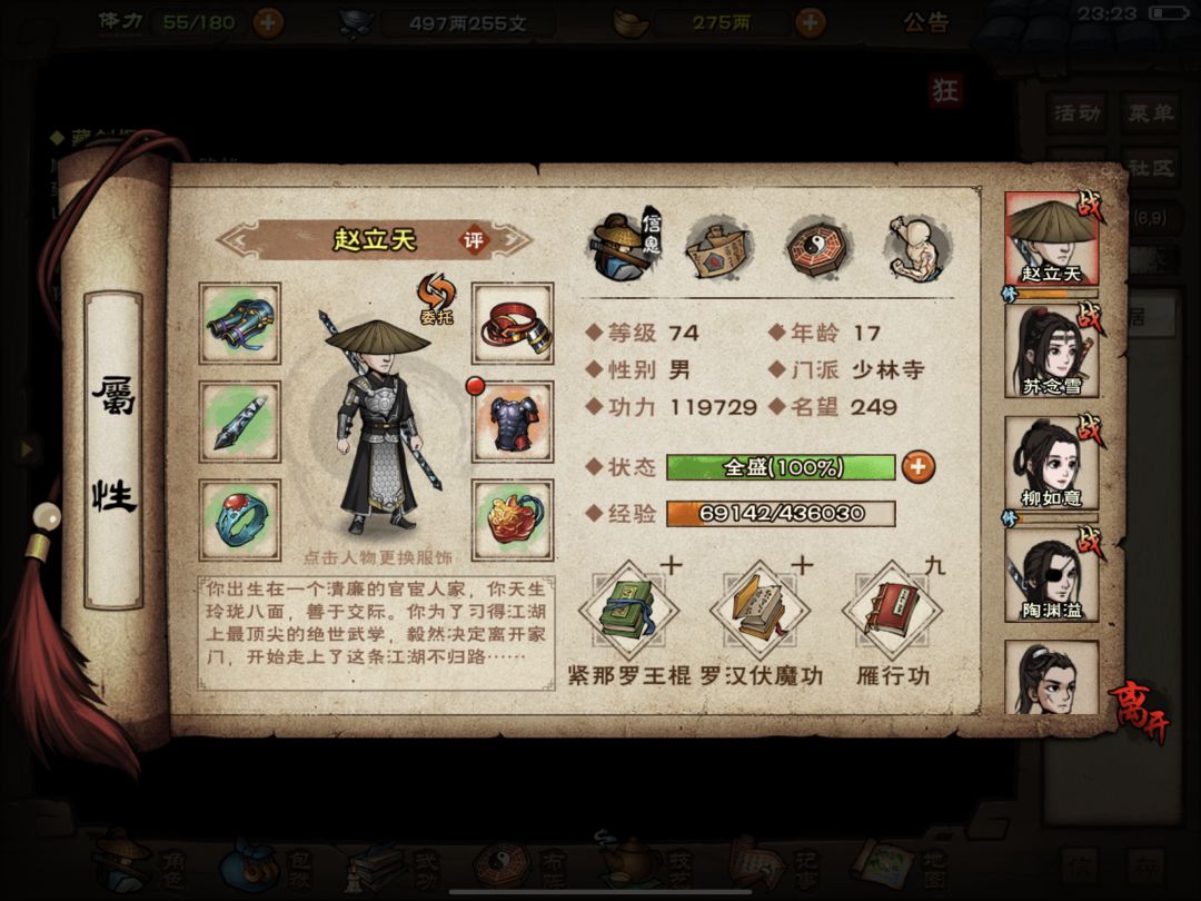 以上这些图呢是我的男号小号,当然了,已经攻略完血衣楼了,主要是给大家看一下武学搭配和秘技,因为武学搭配与获取和我上期攻略相同,在这里我就不赘述了,至于为什么我没有招募钟无月(因为小号偷懒了),至于其他的与我所出的女号过渡攻略基本相同。