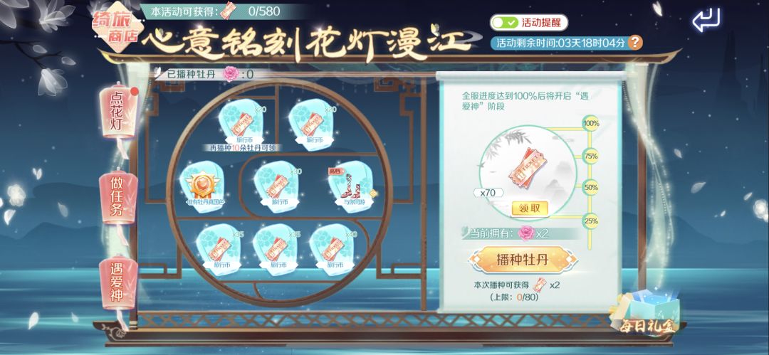 截止至5月29日,参与限时活动【心意铭刻 花灯漫江】,完成任务获得牡丹,播种牡丹点亮牡丹花灯,达到一定的播种数量可以领取旅行币&与你同游鞋子&唯有牡丹真国色活动称号!