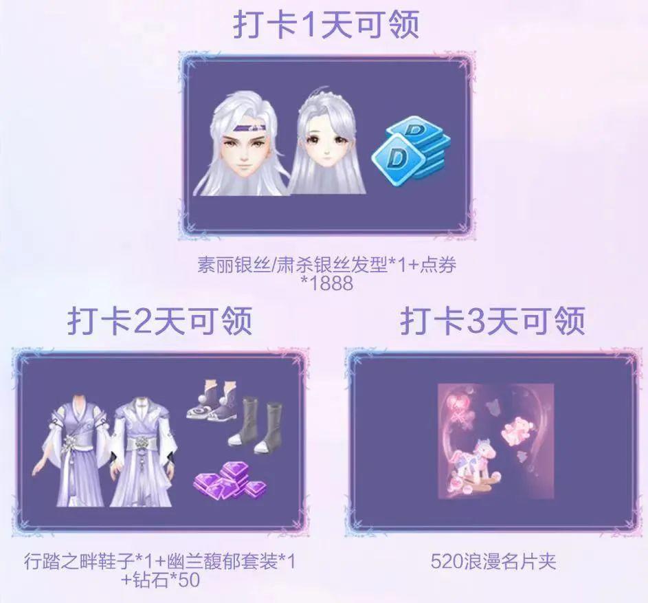 好礼送不停——当天登录游戏并成功分享即视为打卡成功,累计打卡3天还可得组合装&点券&钻石&520名片夹奖励!