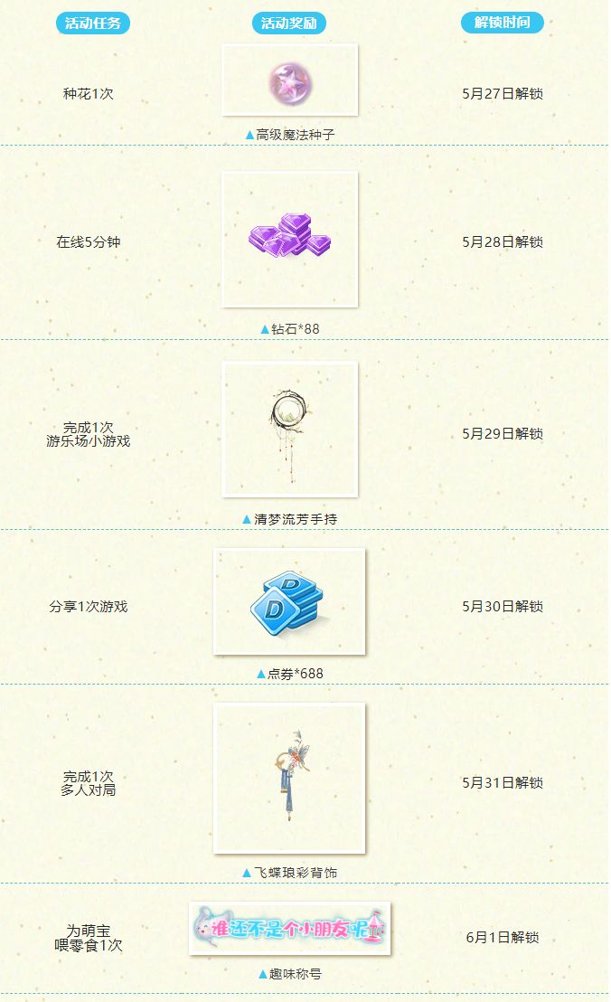 5月27日-6月6日期间,来参与限时活动【“玩”皮一夏】,完成任务即可获得高级魔法种子&钻石*88&清梦流芳手持&点券*688&飞蝶琅彩背饰&“谁还不是个小朋友呢”夏日主题称号!