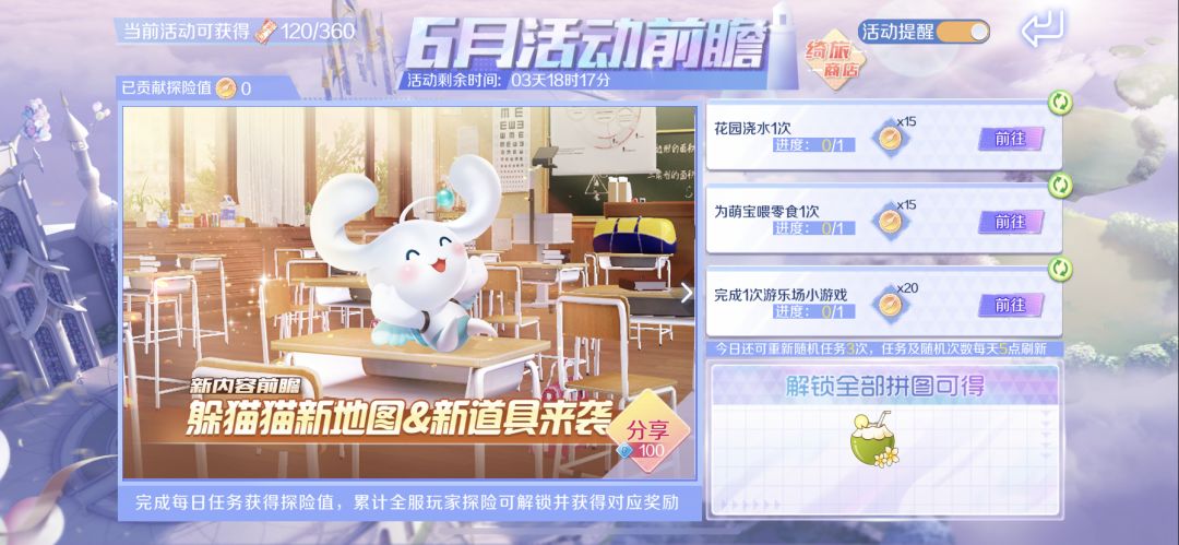 截止至5月29日,来参与限时活动【6月活动前瞻】,完成每日任务获得探险值,累计可获得相应奖励,解锁全部拼图即可获得好椰好椰夏日主题称号!
