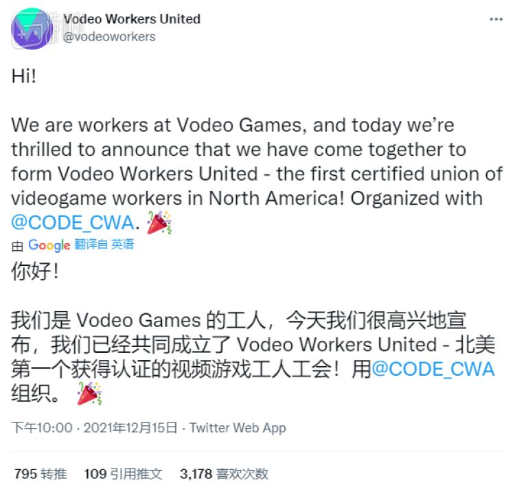 事情起源于2021年12月。当时Raven质保部门的12名员工没有收到续签合同或转正的通知,而是被直接解雇。此后,Raven工作室的60余名员工提出主动辞职,抗议公司裁员;而质保团队也展开了持续数周的罢工运动。这场运动得到了美国通信工人联合会(CWA)的支持,而GWA也是和上述组织合作创立的。