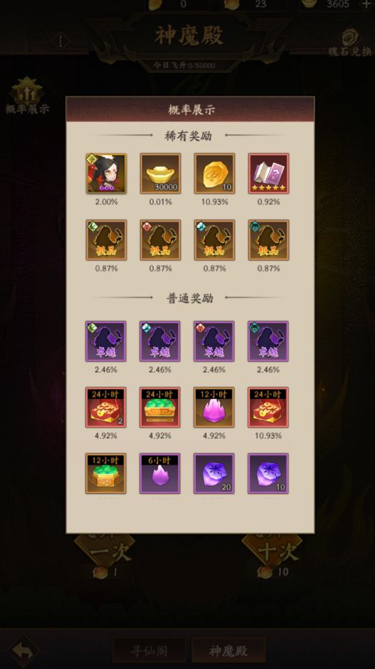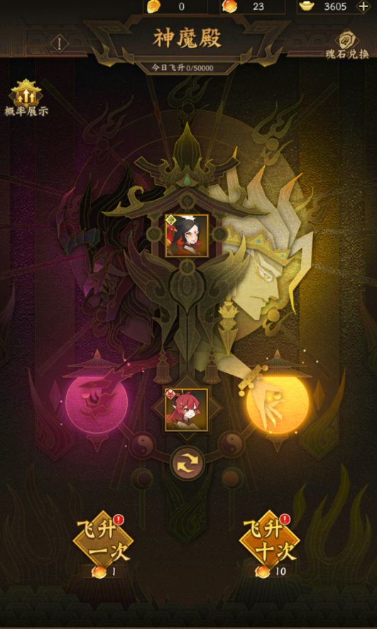 当然神魔殿的十连抽还会产出其他资源以及橙卡,获得飞升灵珠可以免费抽卡,白嫖资源。抽卡还会出六道灵石,可以去商店换所有伙伴。