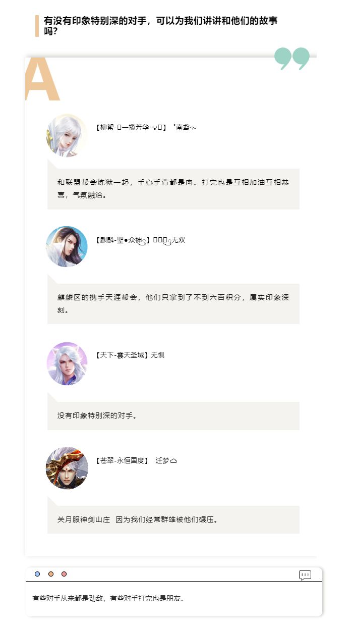 新一届的帮会联赛已经结束,许多帮会都表现出了他们非凡的实力,也为我们留下了很多精彩瞬间!不知道大家有没有好奇,各个职业在帮会联赛中的表现都是如何?我们一起来看看这次的冠军帮主们都是怎么说的吧~