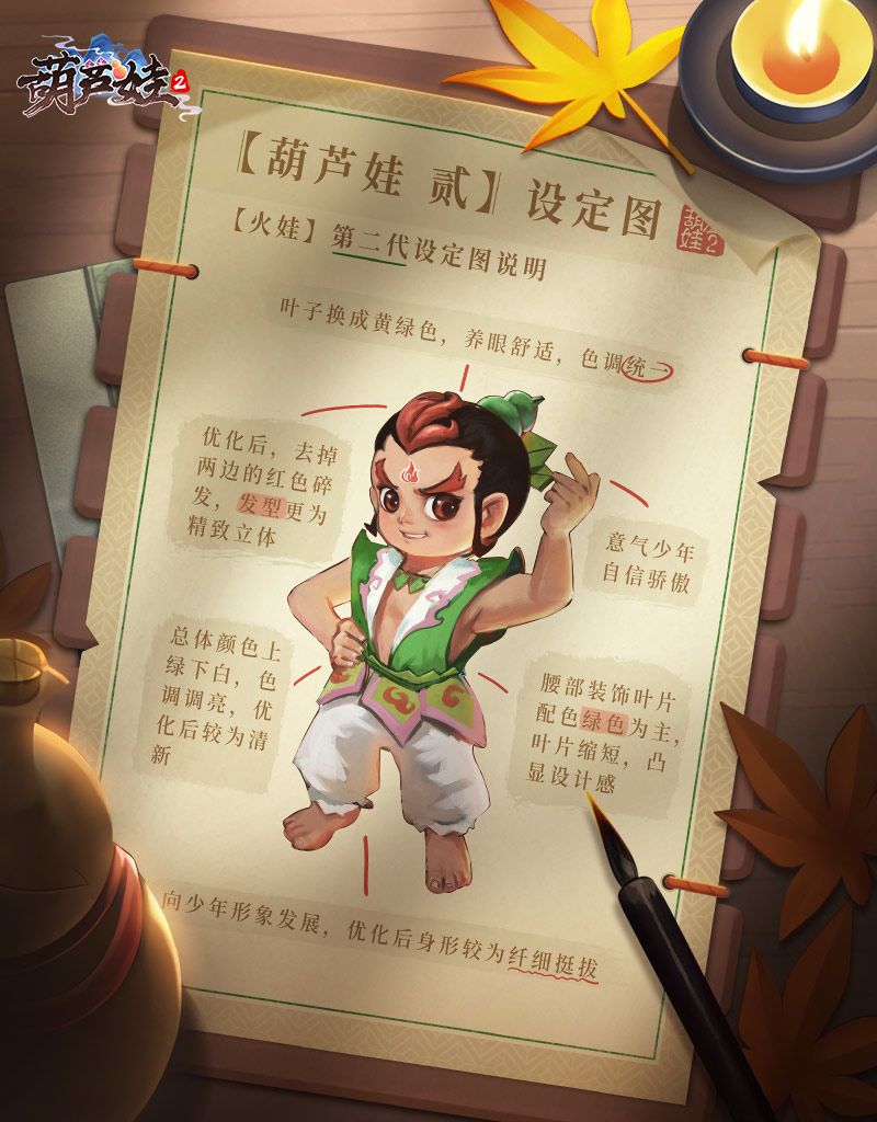 少年感是非常重要的,在原版葫芦娃的设定里,葫芦娃的形象是单纯正义的小英雄,而在《葫芦娃2》手游中,美术组做了很大的改动,希望呈现出意气少年的形象,自信骄傲,正义感十足,有担当与责任。