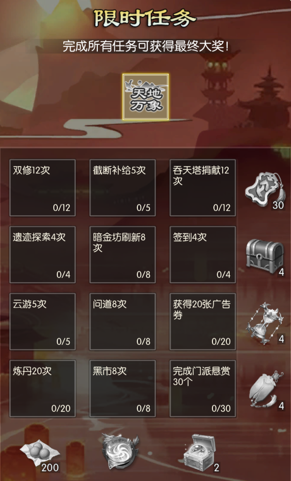 活动详情:因为服务器较多,活动生效可能有延迟,建议道友们在活动完全显示之后再进行相应任务。如果有遗漏也可以一键使用仙玉完成