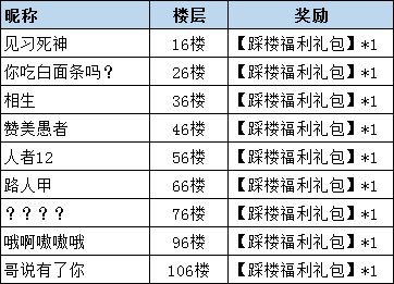 踩中16、26、36、46、56、66、76、96、106楼层的指挥官,每人可获得【踩楼福利礼包】*1