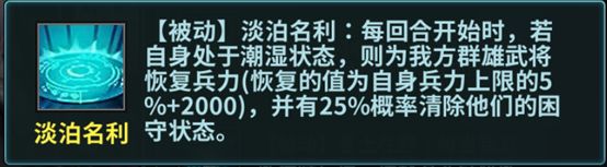 目前潮湿阵容为主流阵容之一,其中司马徽是主要输出,而司马徽的输出又依靠潮湿状态,所以推荐于吉和孔融辅助司马徽,提供潮湿效果。因为弩兵武将比较脆,所以前排推荐高顺(可为群雄武将添加护盾),而且高顺满勋章的情况下,添加护盾的同时还可以增加250士气,极大增加了司马徽怒气技能的出手速度。