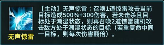 怒气技能-无声惊雷:在潮湿状态下,可多次释放单体攻击技能,如果重复命中同一个目标触发伤害翻倍,秒天秒地。