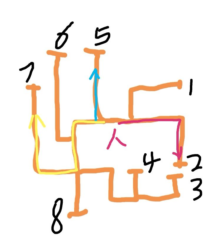 开局在人的位置,不要急,在280秒才开始刷第一个箱子,赶到2号T字位,等到280秒,在这可以看到3号及4号位,如果没有,则去5号位,途中可以看到1号位,1-2-3-4位是首先看的位置,因为刷在3-4号位的话赶路要时间,没有就去5号位,这里可以看到6号位,最后是7号,去7号位时顺带瞄下8号位,找到青铜箱后立即回到2号位等到180秒白银箱刷新,照以上顺序查找,最后黄金箱会在100秒刷新,同样要赶到2号位,同上查找!