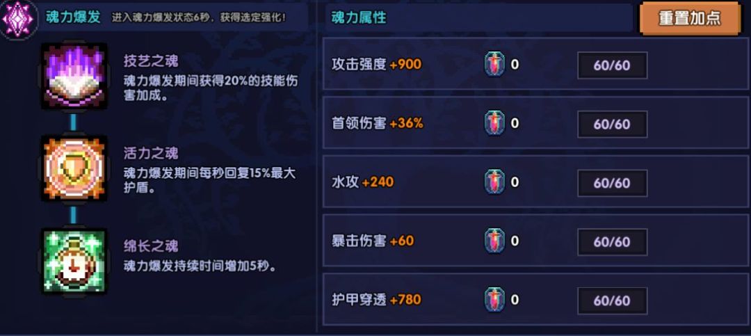 当第一个点到40左右,就可以先点最后一个攻强了,点到大概15左右就换回第一个去点,因为这样收益会高一点,同样的魂力加的攻强更多