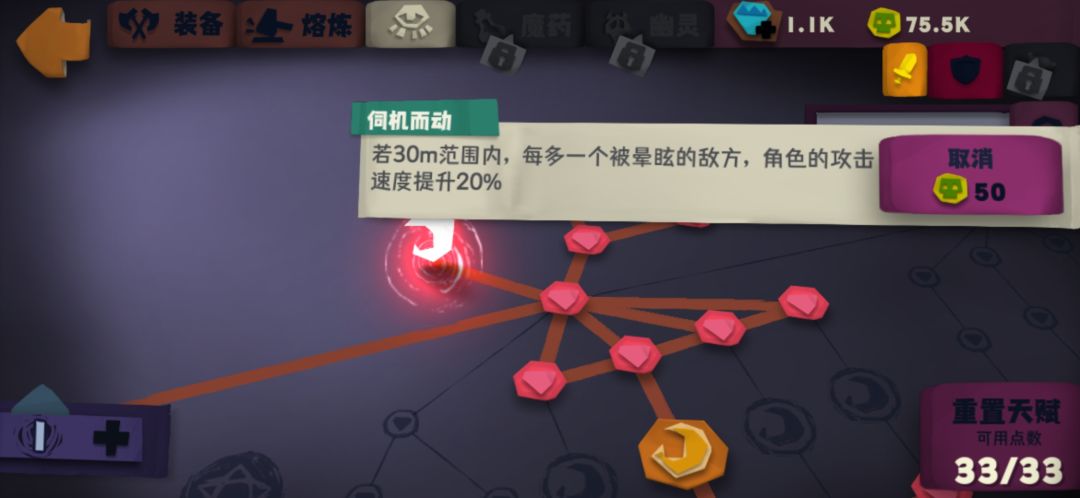 技能描述:30m内,每多一个被眩晕的敌方,角色攻速提升20%,