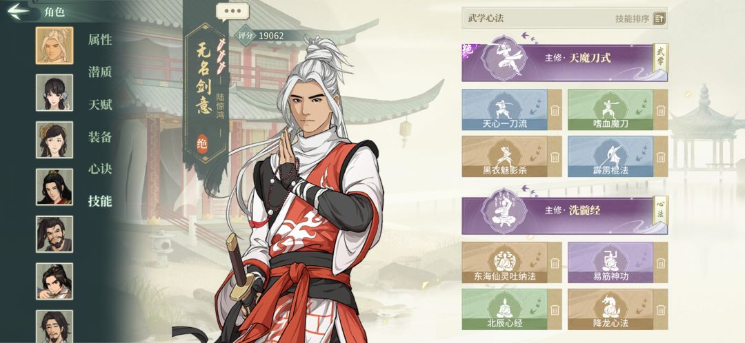 再看心法,刀魔自身是相当脆皮的(一般输出高的都脆),那我们就主洗髓(因为它有霸体),东海(因为它加身法,还有加连击概率),易经加强自己防御,北辰(降低被反击的概率),降龙(加负面抗性,加命中率)。玩着游戏一定要多看自己角色的天赋,然后再去看你手头有哪些心法和外功适合你这个角色(这游戏这么多外功心法,有很多种搭配方法,多研究你会发现很有乐趣)