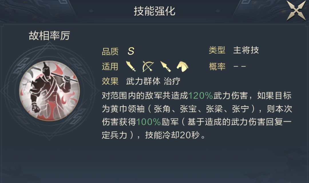攻围黄巾的发动率超过大多数同类技能,但基础伤害率在所有20秒输出技能中几乎处于垫底,并且没有特殊效果,说是最弱20秒输出技能也不为过。但若是攻击目标为黄巾领袖伤害率可达300%,并且必定附加沉默效果,打黄天和打常规完全属于两种极端强度。