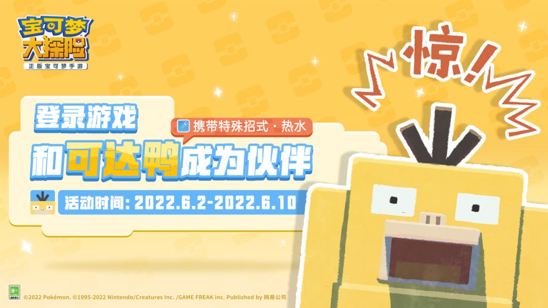 在活动期间登陆游戏,就可以携带特殊招式热水的可达鸭成为伙伴!大家快来和超人气宝可梦鸭鸭做朋友吧~